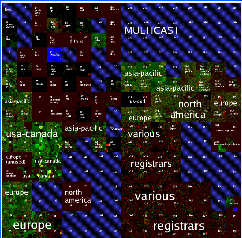 This little application implements JPcap packet sniffing library for java. It is a simple app that shows where you are receiving/sending packets from/to by showing a dot on a map of IPv4 space. It shows a yellow dot for packets that are going through you, and a red dot for packets that are going through others on your network. You need to have jpcap and winpcap installed to run this. -